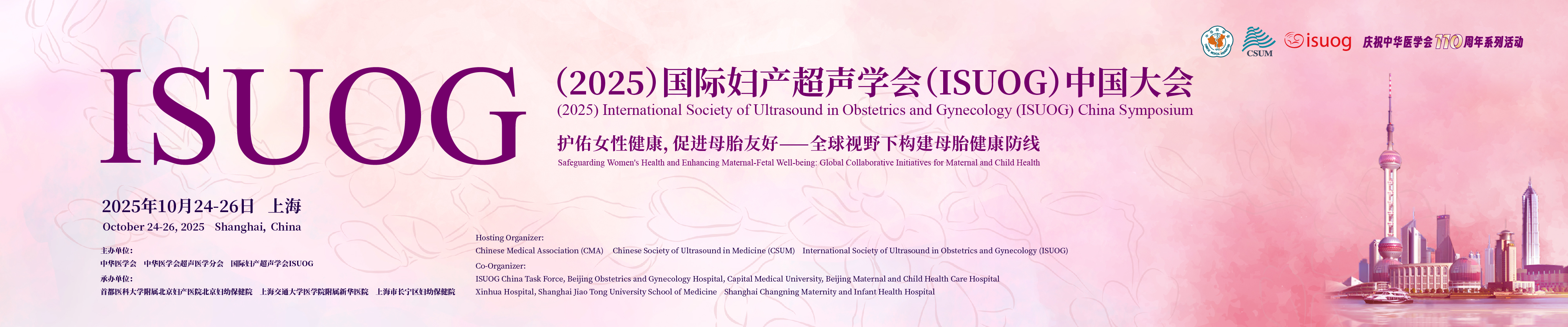 The International Society of Ultrasound in Obstetrics and Gynecology (ISUOG) China Symposium (2025) is held in Shanghai from October 24 to 26, 2025. This meeting is jointly organized by Chinese Medical Association (CMA), Chinese Society of Ultrasound in Medicine (CSUM),ISUOG, and co-hosted by Beijing Obstetrics and Gynecology Hospital, Capital Medical University, Xinhua Hospital, Shanghai Jiao Tong University School of Medicine, Shanghai Changning Maternity and Infant Health Hospital. Chinese Medical Association Ultrasound Branch Obstetrics Group as the academic support unit.